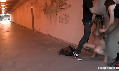 09:57Pale stylish blonde slave Bambi Belle abused and tied up outdoors